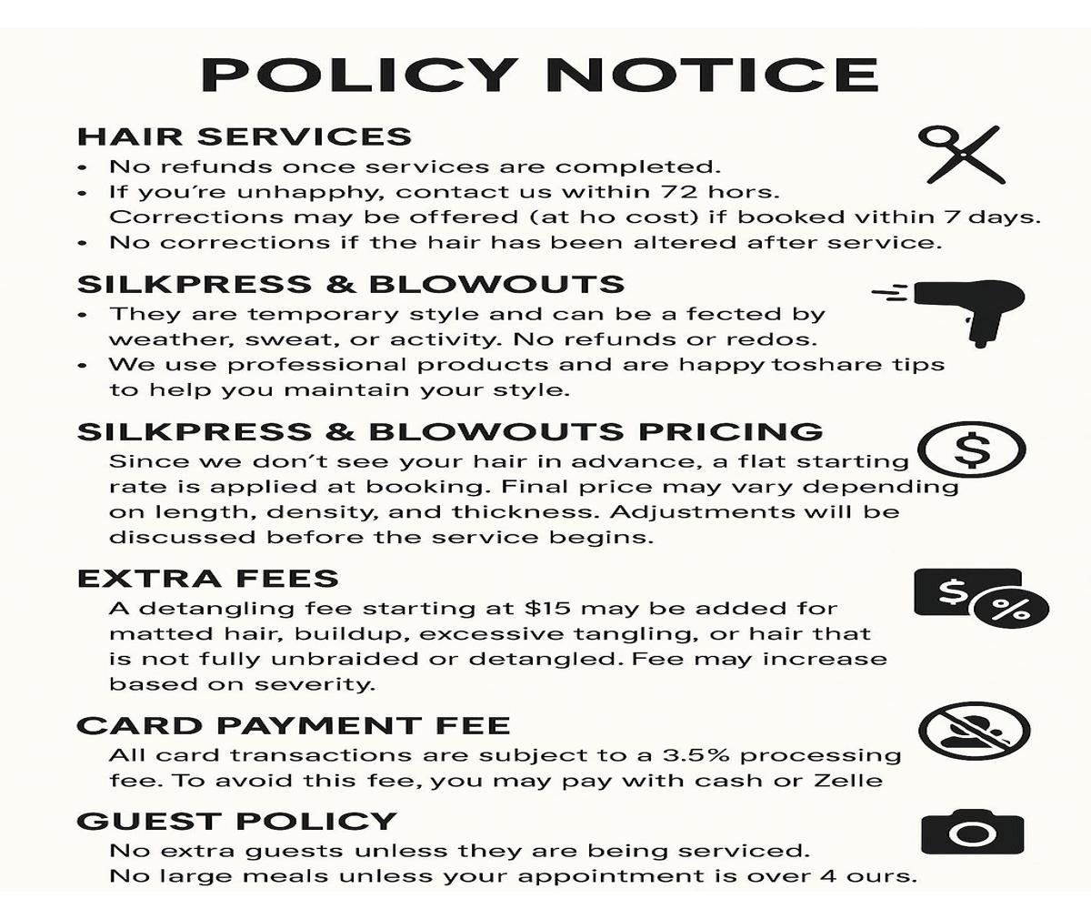 If you have questions, concerns, or feedback about these policies please e-mail the owner at bbsdominicansalon@gmail.com